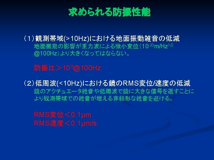 要求と予測 i. KAGRA b. KAGRA Target Calculation Requirement Calculation Displacement @10 Hz [m/r. Hz] → 3 x 10 -17 4 x 10 -20 RMS (velocity) [μm/s] → 3. 1 0. 08 RMS (displace. ) [μm] → 2. 2 0. 1 0. 05