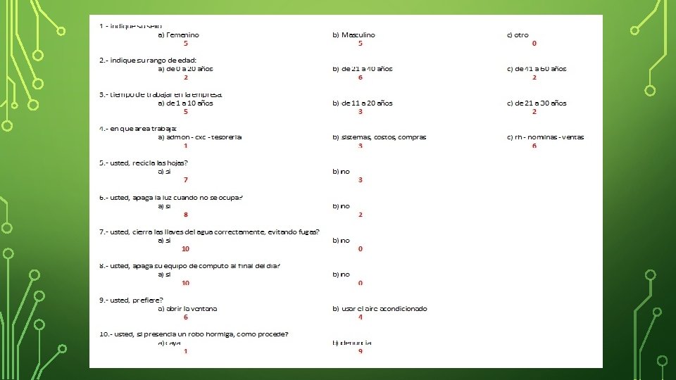 Interpretación de datos o hallazgos: En la visita en el área de ventas, las personas ahí se encuentran bien entrenadas, capacitadas y saben su labor, la falta de sensibilidad en el tema de en el ahorro de energía eléctrica, lo tienen bien manejado, de agua e insumos, tienen a una persona que les lleva el control y a bien dicho del personal no requieren de mas, solo vender porque ellas ganan de la comisión. En el área de recursos humanos, son más herméticos, donde me cuestionaron todo, para que era, quien me manda, cuál era el objetivo de la encuesta y más. Al final solicitaron el vobo de su jefe para llenar el cuestionario. En oficinas se ve que, los tienen controlados, y bien administrados. Que cuentan con una bitácora de entrega de insumos para hacer su labor y que previo existe una solicitud con un mes de anterioridad.