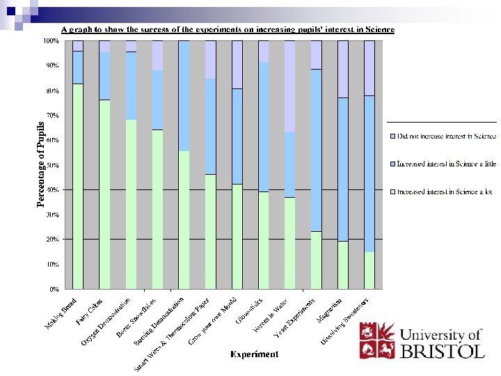 Results contd. n 52. 6% of these said the experiments increased their interest in Science a lot. n Most successful experiments include making bread, fairy cakes and borax snowflakes as well as the two demonstrations. n Experiments such as forces in water, magnetism and dissolving sweeteners are less popular.