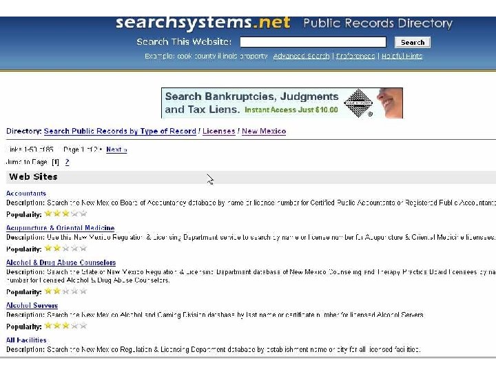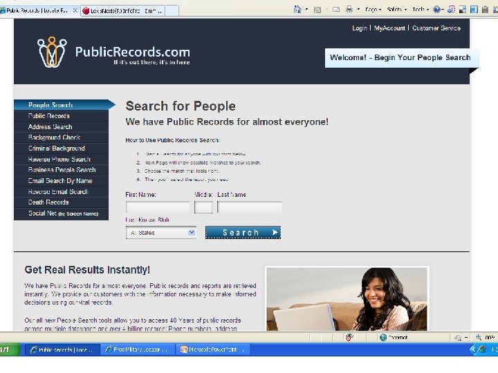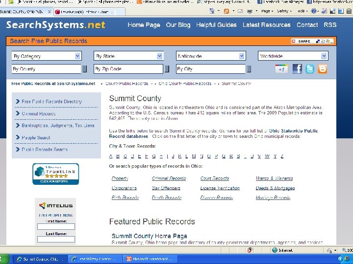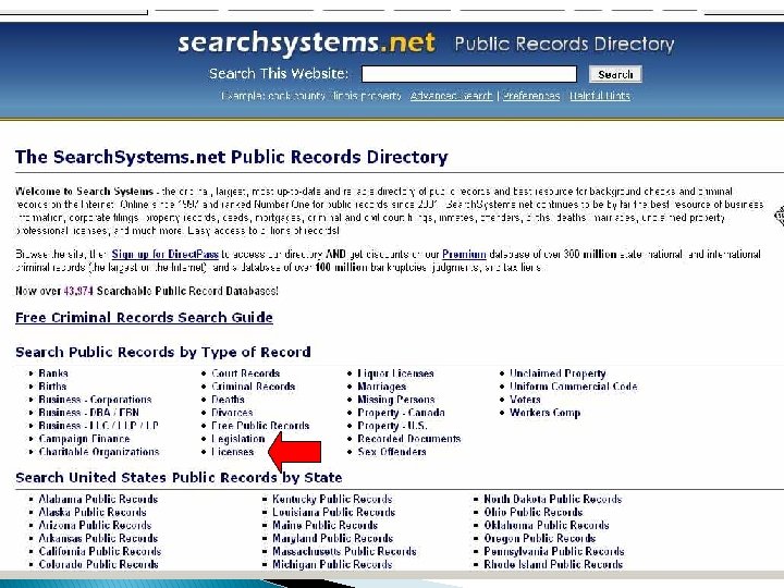 Starting Points and Portals � Comprehensive reports - Lexis, Accurint, Westlaw � Cleveland Marshall’s Public Records Research Guide � Netronline � Search. Systems. net � Public. Records. com � BRB Publications � People Ferret (includes � military)
