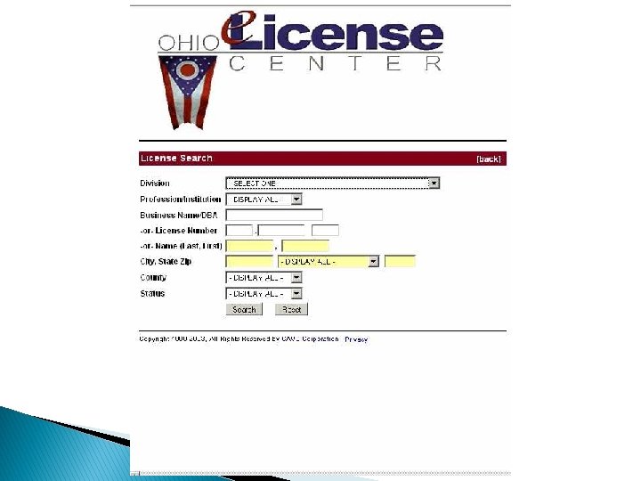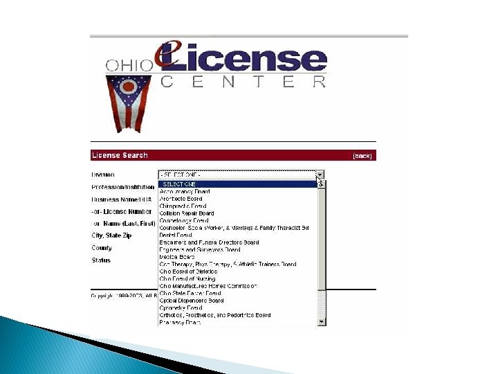 State Medical Board of Ohio � http: //www. med. ohio. gov/professional. htm � Refers back to Ohio License Center