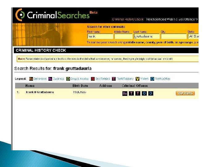 Criminal Records So-called "national" databases inaccessible to non-governmental users. See “National Criminal Background Checks: Myths, Realities & Resources” by Jackie Walters. Pay databases– Lexis. Nexis, Westlaw, Openonline and Accurint may not pick up misdemeanors or all arrests. Examine scope of database before pay to search it.