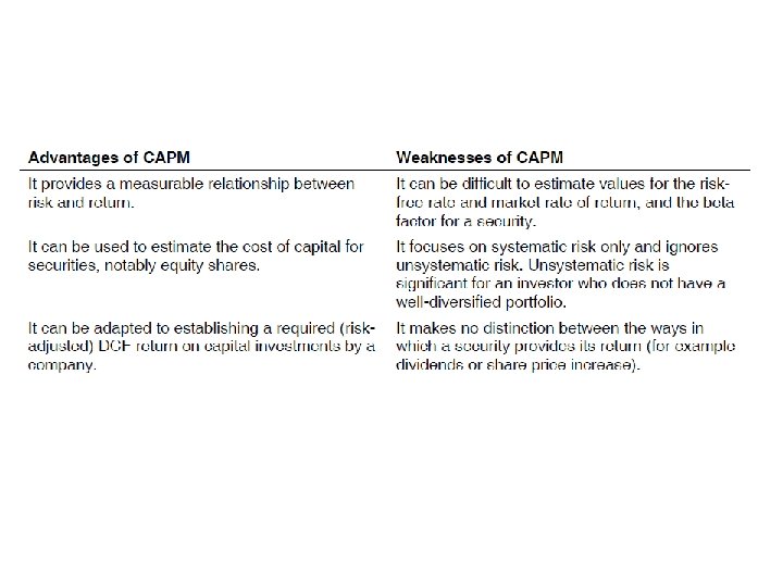Advantages and disadvantages of the CAPM • • • The CAPM is based on some simplifying assumptions. For example, the CAPM assumes: A perfect capital market Uniformity of investor expectations All forecasts (expectations) are made in the context of just one time period. In spite of these simplifying assumptions, the CAPM appears to be reliable in practice.