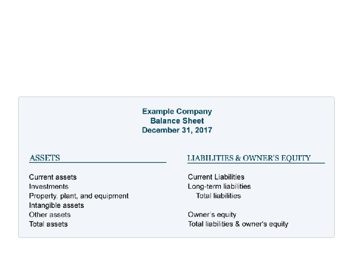 Accounting liquidity • Refers to the ease and quickness with which assets can be converted to cash. • Current assets are the most liquid and include cash and those assets that will be turned into cash within a year from the date of the balance sheet.