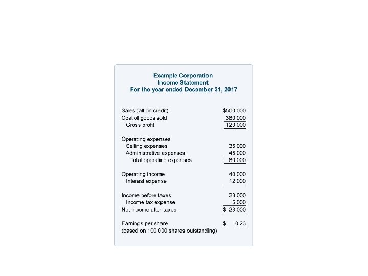 Non-operating section • Other revenues or gains - revenues and gains from other than primary business activities (e. g. , rent, income from patents, goodwill). It also includes unusual gains that are either unusual or infrequent, but not both (e. g. , gain from sale of securities or gain from disposal of fixed assets) • Other expenses or losses - expenses or losses not related to primary business operations, (e. g. , foreign exchange loss). • Finance costs - costs of borrowing from various creditors (e. g. , interest expenses, bank charges). • Income tax expense - sum of the amount of tax payable to tax authorities in the current reporting period (current tax liabilities/ tax payable) and the amount of deferred tax liabilities (or assets).