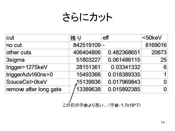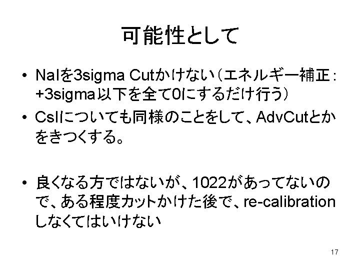 invis 20071109 Kaneda 1 Sigma cut Cs I Slides: 25 Download presentation invis 2007/11/09 Kaneda 1 Sigma cut (Cs. I) 2 Sigma cut (Na. I) 3 数 現在のリミットETH-7 この数だと o-Ps->invisi Limit: ~4 x 10 Zurich: 4. 2 x 10 -7 (2006) 4 Souce Adv (after other cuts) 黒がすべて、赤が<50 ke. Vイベント 5 Source Cs. I 6 Trigger Adv (after other cuts) 7 Trigger Cs. I 7 mu 2 mu 8 Trigger 7 mu-2 mu 9 (Tri 7 mu-2 mu) v. s. Tri. Adv 160 ns adv 4. 5 mu adv 7 mu-2 mu 10 空いてるチャンネル(after other cuts) 11 Scaler 12 Total 13 Tot 15 Tot 16 Backup (11/2分) 18 19 20 21 CsI sigma cut eff sourceは汚いので、 1 sigma= 2. 7 ch*2 (ke. V) 他は 1 sigma=0. 5 ch*2(ke. V) 22 24 1 sigma= 3. 7 ch*1. 5 (ke. V) 25