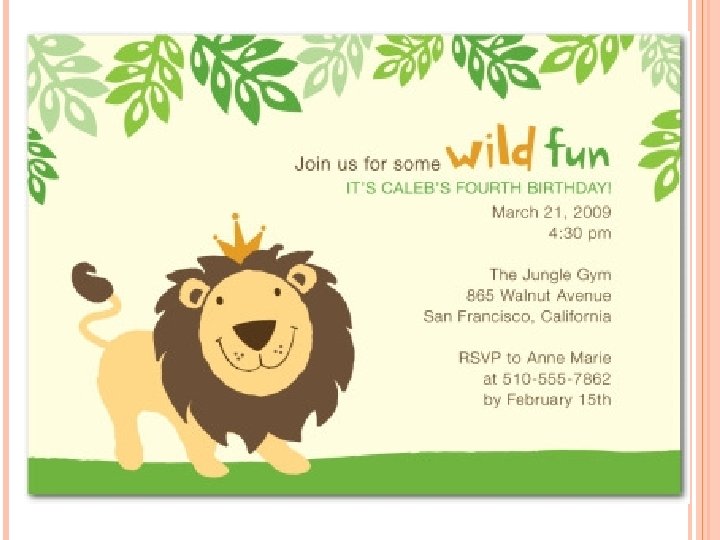 INFORMATION REQUIRED FOR THEBIRTHDAY INVITATION! WHO Who is hosting the event and who is being invited WHERE Where the event is being held WHY The reason for the celebration WHEN The Date and the Time of the event WHAT Any special instructions - bring a bottle, fancy dress etc. HOW How to reply! üContact info ( address or, if an informal invite, telephone number, FAX or email address ) üRSVP requesting a formal written reply, Informal reply by telephone, FAX or email - Reply Deadline Date