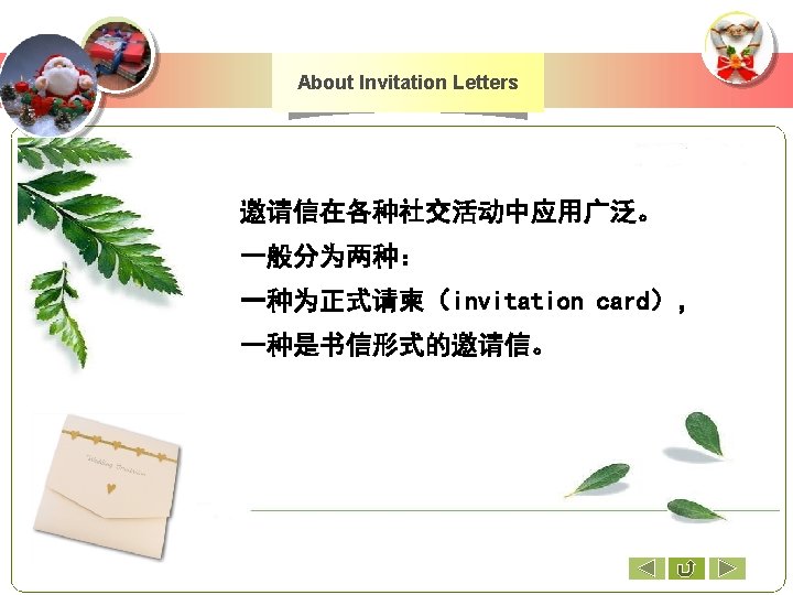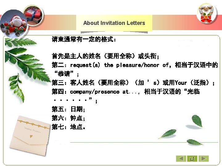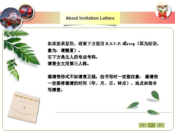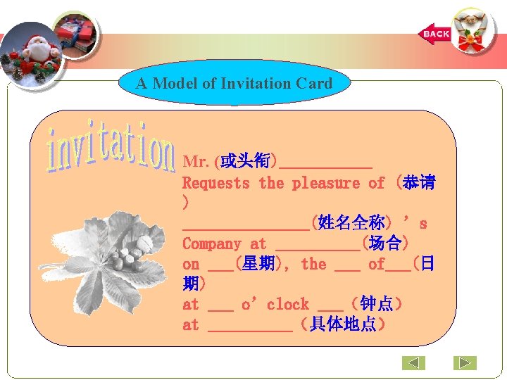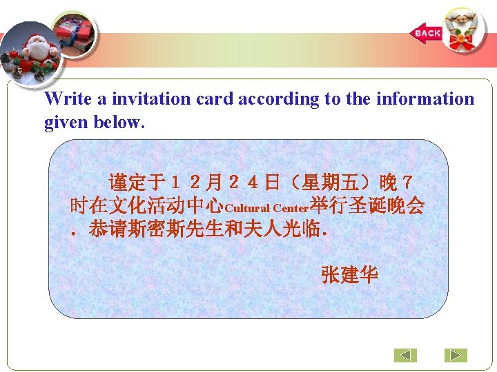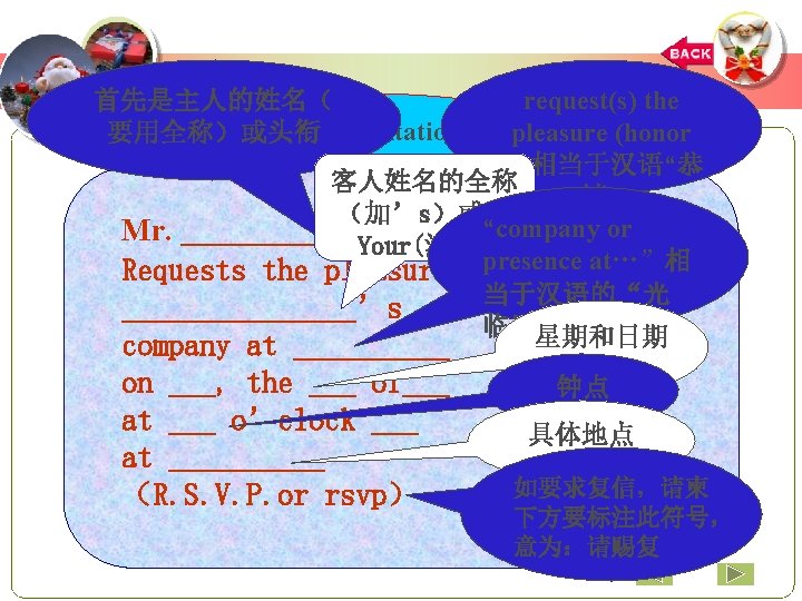 A Sample Invitation Card Mr. Zhang. Jianhua Requests the pleasure of Mr. and Mrs. Smith's company at the Christmas party on Friday, the 24 th of December at 7 o’clock pm at the Cultural Center. 上一页 下一页