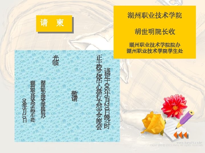 The party will be held at Room 402, Golden Flower Hotel, Nanjing Road at 7: 00 the next Friday evening. (时间和地点) Please inform us if you could make it. We’ll be eagerly waiting for your coming. 邀请时间应该包括年, 月,日和钟点;邀请 Affectionately, 地点应写得准确,具 Thomas and Cathy 体。