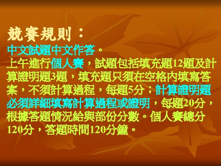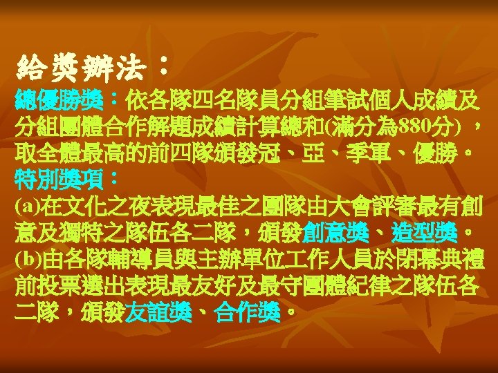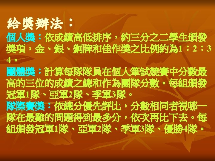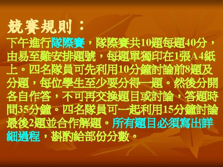 青少年數學國際城市邀請賽 (Invitational World Youth Mathematics Intercity Competition) 主辦單位:e. Thekwini Municipality and AMESA 指導單位: The Office of the Presidency and Kwa. Zulu-Natal Department of Education 日期: 2009年 7月5~10 日 地點:南非德班(Durban) 名額:全國共 16名(另 1名女生與其他三國 學生組成加拿大-國際女子隊) 2010年在韓國釜山舉行