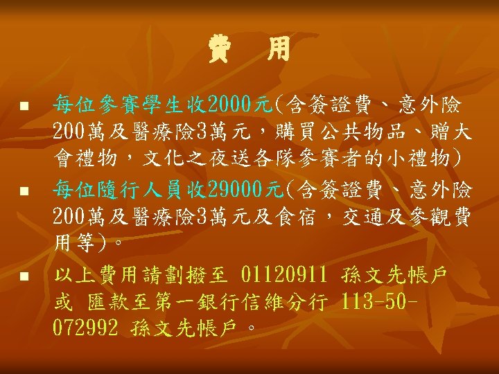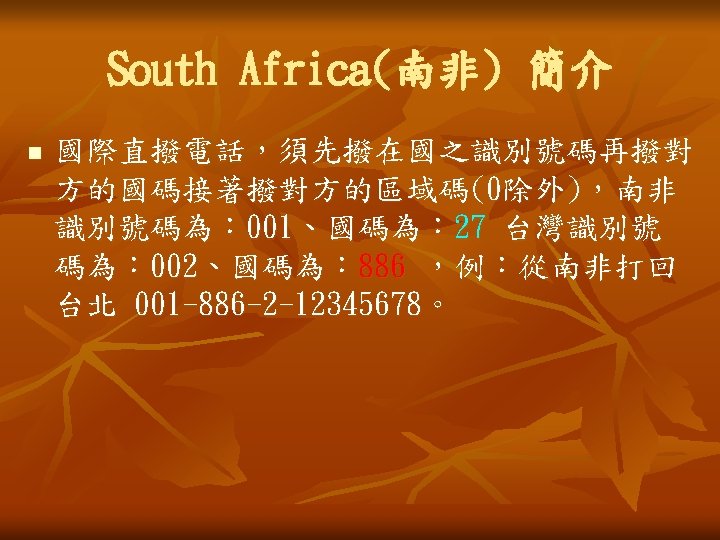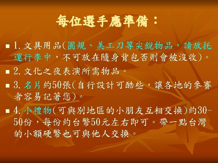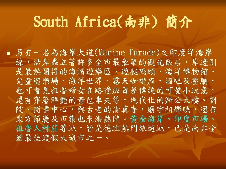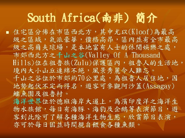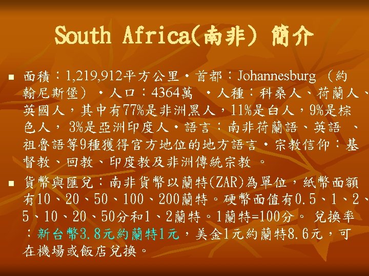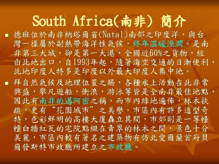 To: South Africa Manpower and Immigration. We the undersigned are the parents of ______________. 填寫學生 英文姓名 From July 5 to July 11, our child will be attending 10 th INVITATIONAL WORLD YOUTH MATHEMATICS INTERCITY COMPETITON to be held at DURBAN, SOUTH AFRICA.