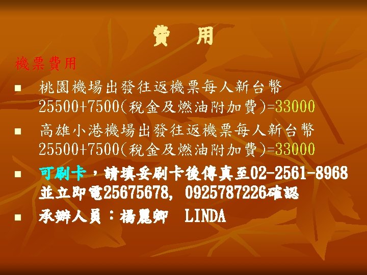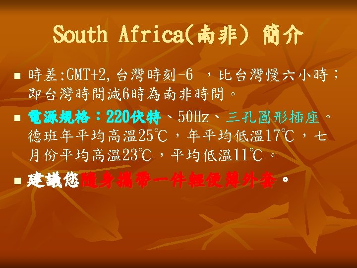 注意事項 航班資料:桃園機場出發 n 去程: n CX 531 04 JUL TPEHKG SA 287 04 JUL HKGJNB HKG SA 539 05 JUL JNBDUR HKG n 回程: n n n 20: 20 22: 00 23: 50 07: 00+1 08: 55 10: 05 SA 554 10 JUL DURJNB HKG 12: 40 13: 50 SA 286 10 JUL JNBHKG 16: 30 12: 15+1 CX 564 11 JUL HKGTPE HKG 13: 15 14: 55 請於七月四日 18: 20在桃園機場第一航廈國泰團體櫃 台集台。