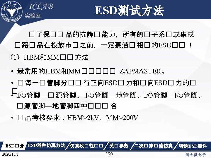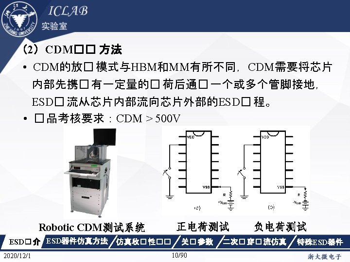 I/O管脚—I/O管脚—地管脚ESD测试 Positive to VSS Negative to VSS Positive I/O管脚—电源管脚ESD测试 ESD� 介 ESD器件仿真方法 Positive 2020/12/1 to VDD 仿真收� 性�� Negative to VDD Negative 电源管脚—地管脚 关� 参数 9/90 二次� 穿� 流仿真 Positive 特殊ESD器件 Negative 9/101