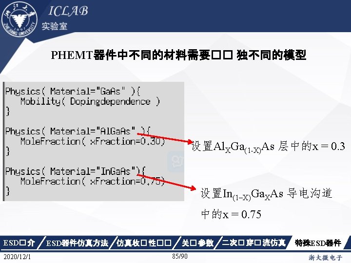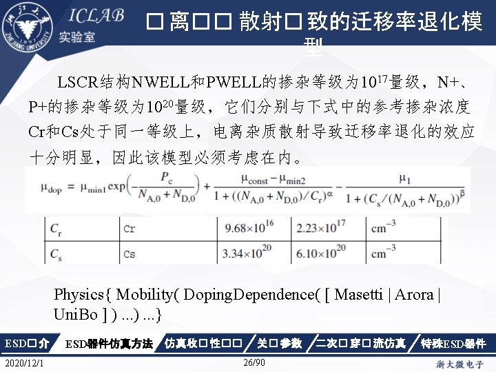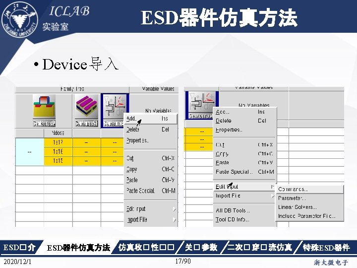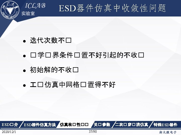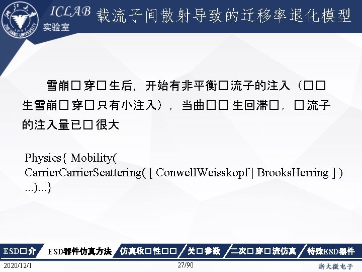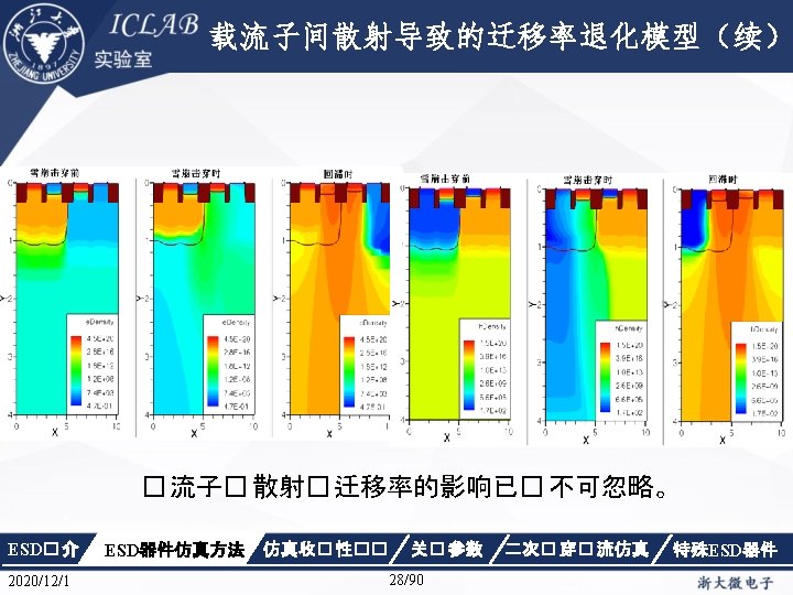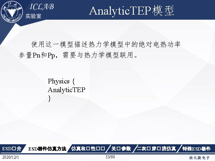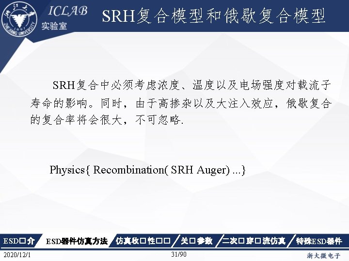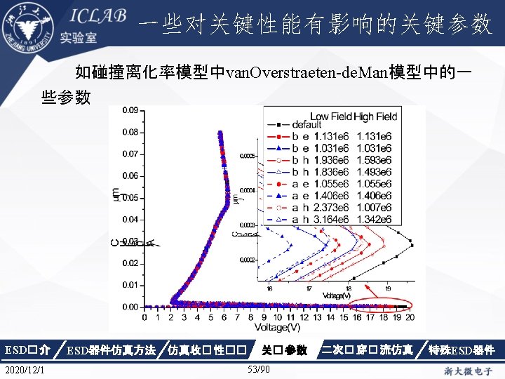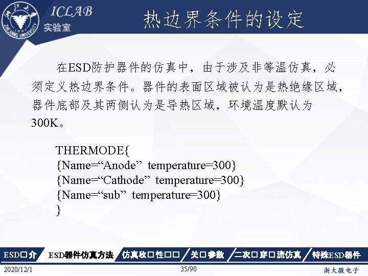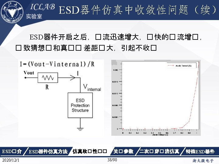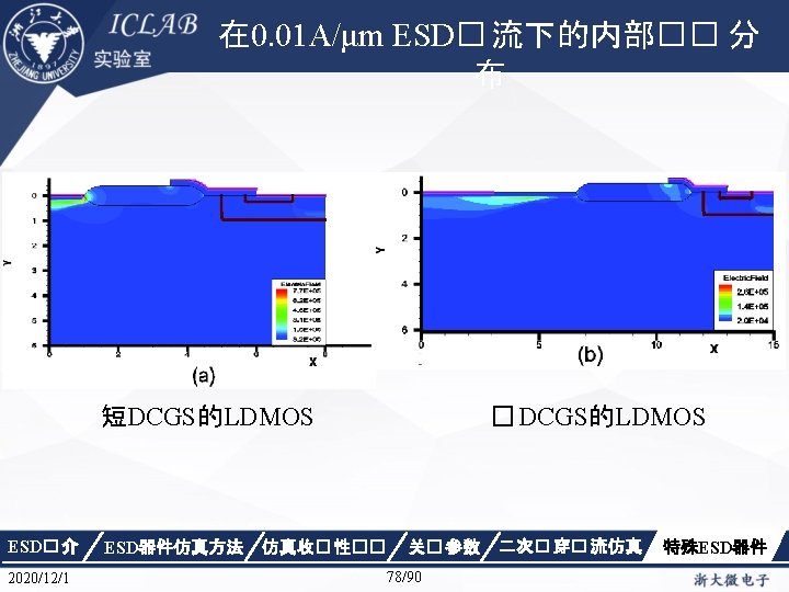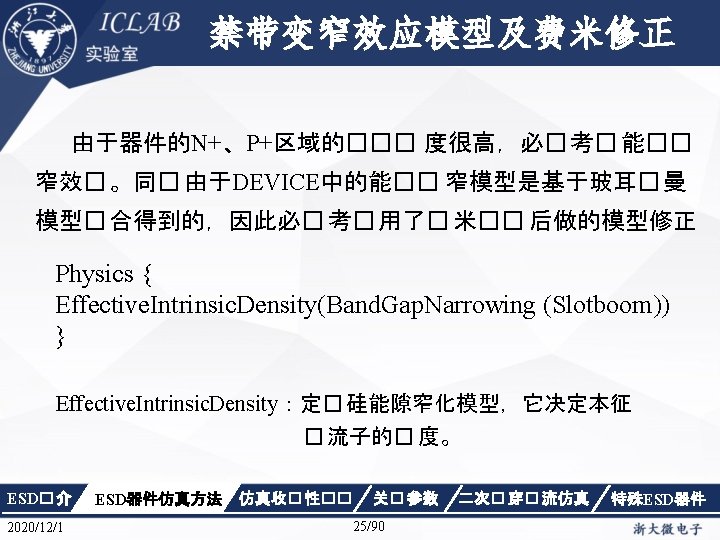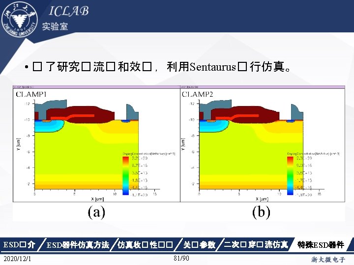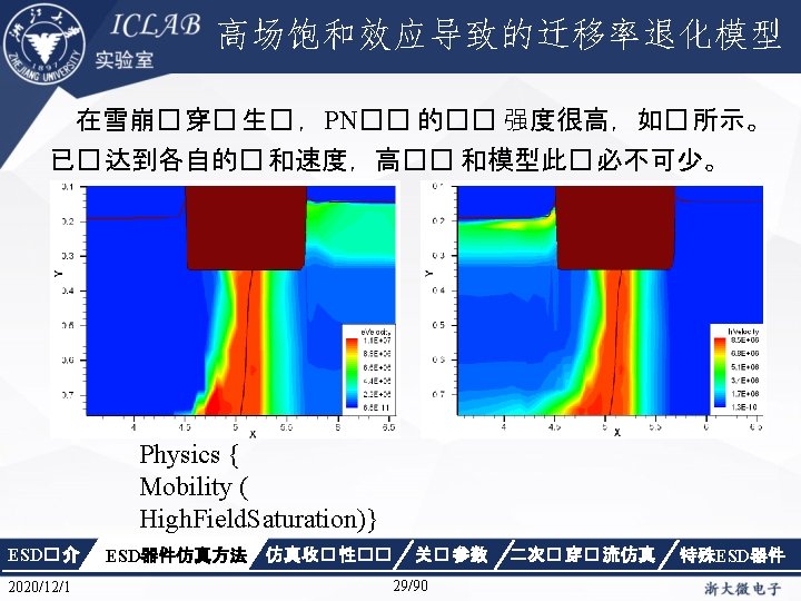 Physics { Fermi Effective. Intrinsic. Density (Band. Gap. Narrowing (Old. Slotboom)) Mobility(Dopingdependence High. Field. Saturation Enormal Carrier. Scattering) Recombination(SRH(Doping. Dependence Temp. Dependence tunneling) Auger Avalanche(Eparallel)) Incomplete. Ionization Thermodynamic Analytic. TEP } ESD� 介 2020/12/1 ESD器件仿真方法 仿真收� 性�� 关� 参数 34/90 二次� 穿� 流仿真 特殊ESD器件