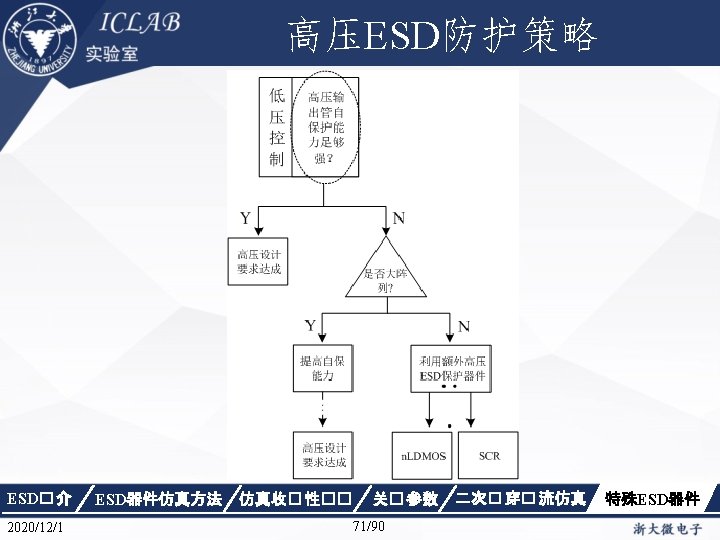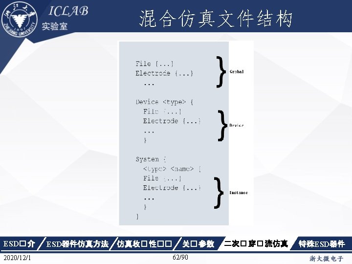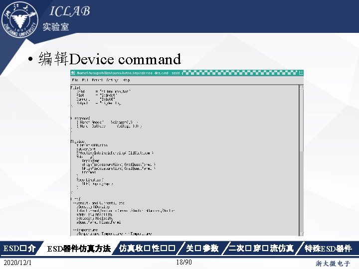 混合仿真在ESD设计中的应用 Device SCR{ File { Grid = "n 2_msh. tdr" Current = "n 4_des. plt“ Plot = "n 4_des. dat”} Electrode { { Name="anode" Voltage=0 Area=50} { Name="cathode" Voltage=0. 0 Area=50}} Thermode { { name="anode" temperature=300 } { name="cathode" temperature=300} } ESD� 介 2020/12/1 ESD器件仿真方法 仿真收� 性�� Physics { Fermi Effective. Intrinsic. Density (Band. Gap. Narrowing (Old. Slotboom) Fermi) Mobility(Dopingdependence High. Field. Saturation Enormal Carrier. Scattering) Recombination(SRH(Doping. Depend ence Temp. Dependence tunneling) Auger. Avalanche(Eparallel)) Thermodynamic Analytic. TEP } Physics(Material. Interface="Oxide/Silic on") {charge(surfconc=5. e 10)} } 关� 参数 63/90 二次� 穿� 流仿真 特殊ESD器件
