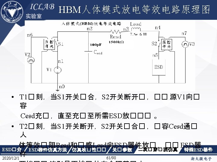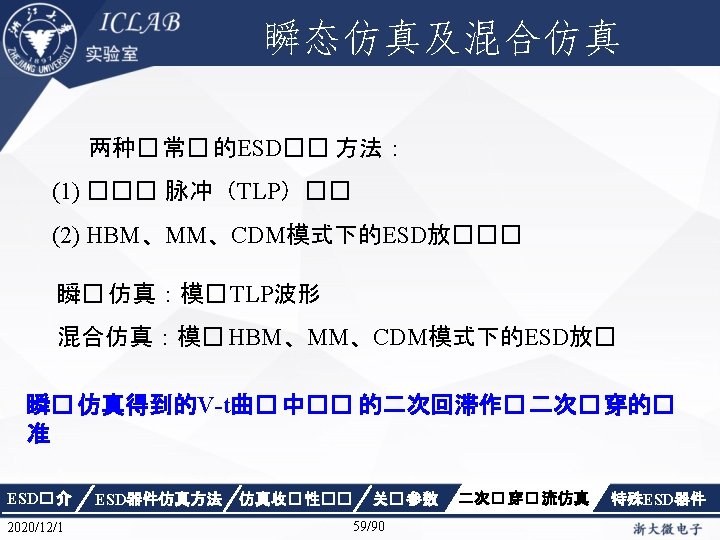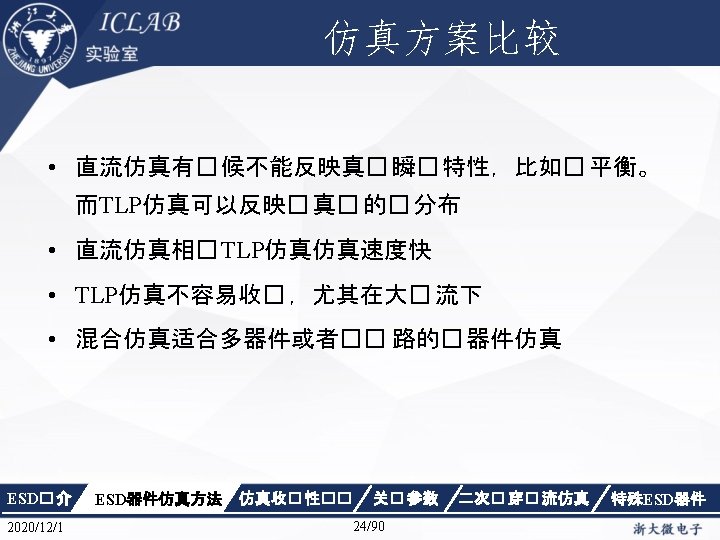 几种测试模型 Model Parameters Parasitic Components Standard Level Model Time rise (nsec) Time decay (nsec) Vpeak (V) Cesd (p. F) Resd (Ω) Lesd (μH) Okey (V) Safe (V) Super (V) HBM ≈10 150± 20 2000~15000 1500 7. 5 2000 4000 10000 MM ≈ 6~7. 5 60 -90 (ring period) 100 -400 200 数十 1 -2 200 400 1000 CDM < 0. 2 -0. 4 -2 250 -2000 6. 8 数十 1 -2 500 1000 2000 等效放电电路 ESD� 介 2020/12/1 ESD器件仿真方法 仿真收� 性�� 关� 参数 23/90 二次� 穿� 流仿真 特殊ESD器件