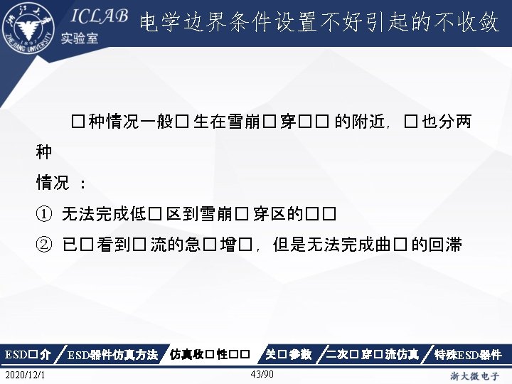 解决方法 � 定minstep 和 interations: minstep的数� 至少比initialstep少 3个数量� Solve { Hole } Math { Iterations =15 Not. Damped = 50 Extrapolate Rel. Err. Control } ESD� 介 2020/12/1 ESD器件仿真方法 Poisson Coupled { Poisson Electron New. Current. Prefix="snapback“ Quasistationary ( Initialstep=1 e-6 Max. Step=0. 1 Minstep=1 e-12 increment=2. 0 Goal { name="anode" voltage=4 e 7} ) { Coupled { Poisson Electron Hole Temperature} } } 仿真收� 性�� 关� 参数 42/90 二次� 穿� 流仿真 特殊ESD器件