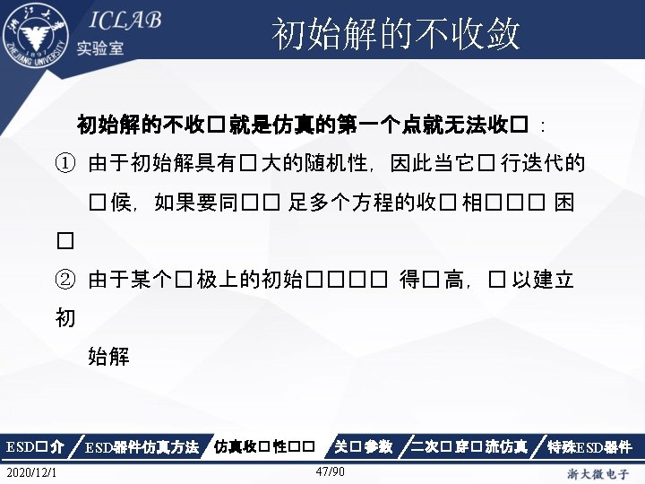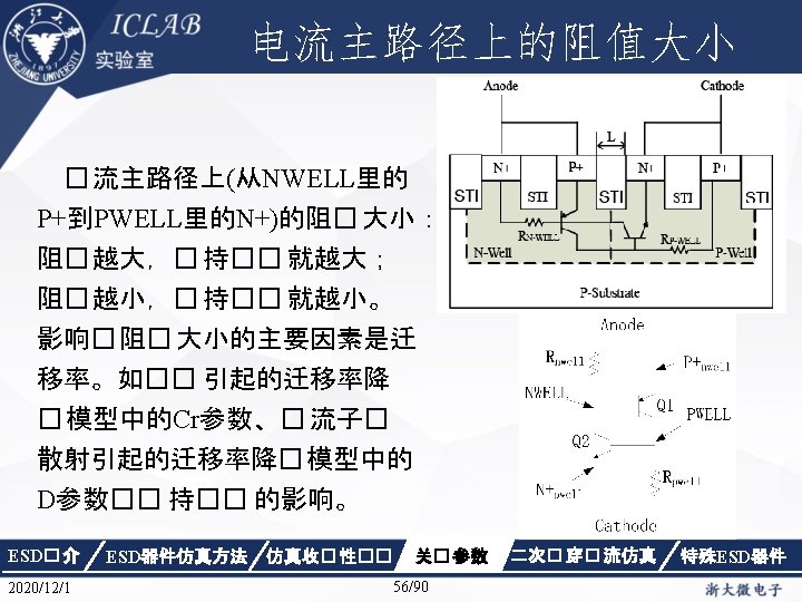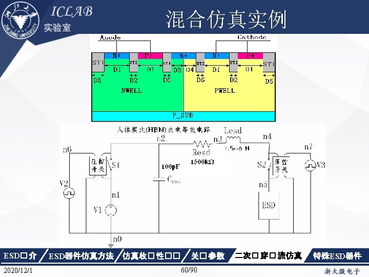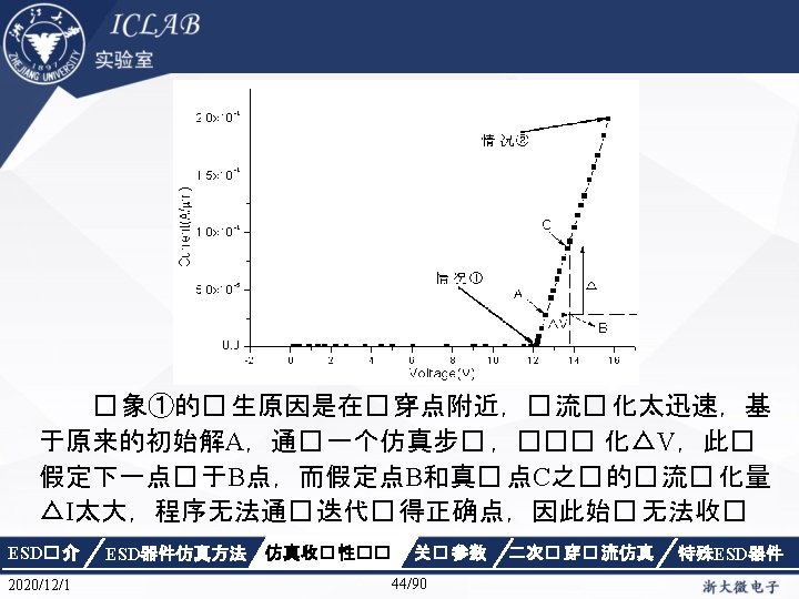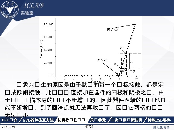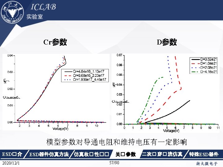解决方法 Electrode { { Name="anode" Voltage=0. 0 resistor=3 e 9} { Name="cathode"Voltage=0. 0 } { Name="sub" Voltage=0. 0 }} ESD� 介 2020/12/1 ESD器件仿真方法 仿真收� 性�� 关� 参数 46/90 二次� 穿� 流仿真 特殊ESD器件