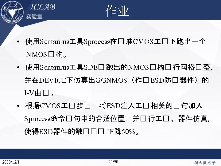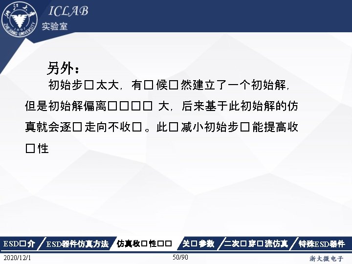 ②的解决方法 Electrode{ Name=”Drain”, Voltage=0. 0 Name=”Source”, Voltage=0. 0 Name=”Gate”, Voltage=5. 0 Name=”sub”, Voltage=0. 0 } …… Solve{ …… } ESD� 介 2020/12/1 ESD器件仿真方法 仿真收� 性�� Electrode{ Name=”Drain”, Voltage=0. 0 Name=”Source”, Voltage=0. 0 Name=”Gate”, Voltage=0. 0 Name=”sub”, Voltage=0. 0 } …… Solve{ …… Goal{name=”Gate”, Voltage=5. 0} } 关� 参数 49/90 二次� 穿� 流仿真 特殊ESD器件