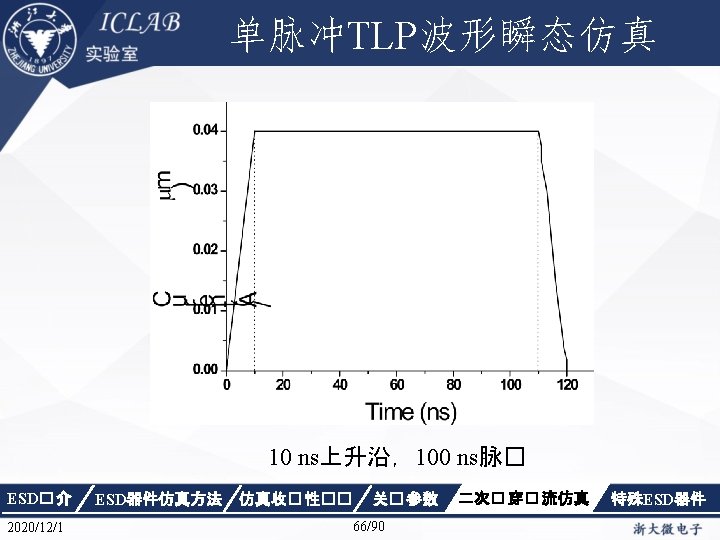 混合仿真在ESD设计中的应用(续 2) plot { e. Density h. Density e. Current h. Current Electric. Field e. Quasi. Fermi h. Quasi. Fermi Potential/vector Doping Space. Charge SRH Auger Avalanche e. Mobility h. Mobility Donor. Concentration Acceptor. Concentration Effective. Intrinsic. Density Doping} Math { Iterations =20 Not. Damped = 50 Digits=4 Extrapolate Rel. Err. Control No. Check. Transient. Error} ESD� 介 2020/12/1 ESD器件仿真方法 Solve { Coupled {Poisson} Coupled {Circuit} Coupled { Poisson circuit} New. Current. Prefix="scr_10 V-50 Width" unset(n 2) Transient (Initial. Time=0 Final. Time=1 e-9 Initial. Step=5 e-11 Max. Step=2 e-10 Min. Step=1 e-14) { Coupled{ Poisson Electron Hole Temperature circuit }} Transient (Initial. Time=1 e-9 Final. Time=3 e-9 Initial. Step=3 e-11 Max. Step=3 e-10 Min. Step=1 e-17) { Coupled{ Poisson Electron Hole Temperature circuit }} Transient (Initial. Time=3 e-9 Final. Time=1 e-8 Initial. Step=3 e-10 Max. Step=1 e-9 Min. Step=1 e-17) { Coupled{ Poisson Electron Hole Temperature circuit }} Transient (Initial. Time=1 e-8 Final. Time=1 e-7 Initial. Step=3 e-9 Max. Step=1 e-8 Min. Step=1 e-16) { Coupled{Poisson Electron Hole Temperature circuit }} Transient (Initial. Time=1 e-7 Final. Time=1 e-6 Initial. Step=3 e-8 Max. Step=1 e-7 Min. Step=1 e-15) { Coupled{Poisson Electron Hole Temperature circuit}}} 仿真收� 性�� 关� 参数 65/90 二次� 穿� 流仿真 特殊ESD器件