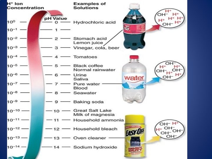 p. H Scale As you move from p. H 0 to p. H 14, the concentration of H+ DECREASES (10 times each number) As you move from p. H 0 to p. H 14, the concentration of OH- INCREASES (10 times each number) Ex: A substance with p. H 3 is 100 times stronger acid than a substance with p. H 5. A substance with p. H 8 is 100 times weaker base than a substance with p. H 10.