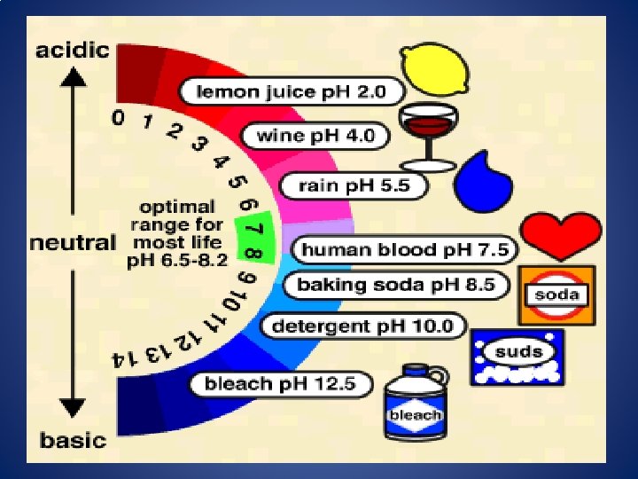 p. H Scale • • Ranges from 0 -14 Numbers 0 -6 represent acids 7 is neutral Numbers 8 -14 represent bases 0 1 2 3 4 5 6 7 8 9 10 11 12 13 14 strongest acid strongest base