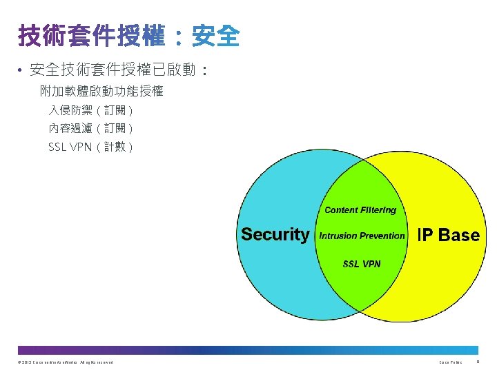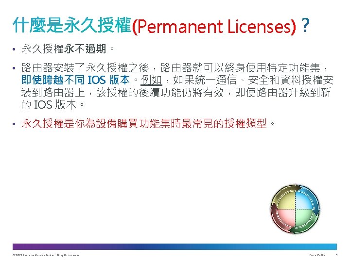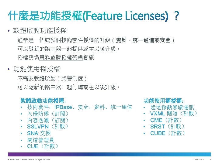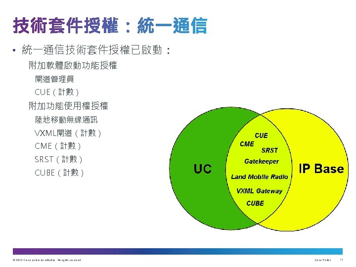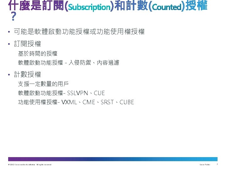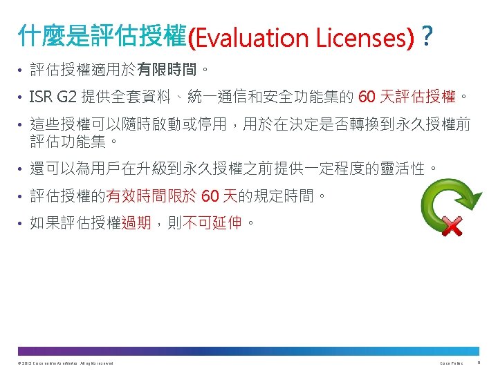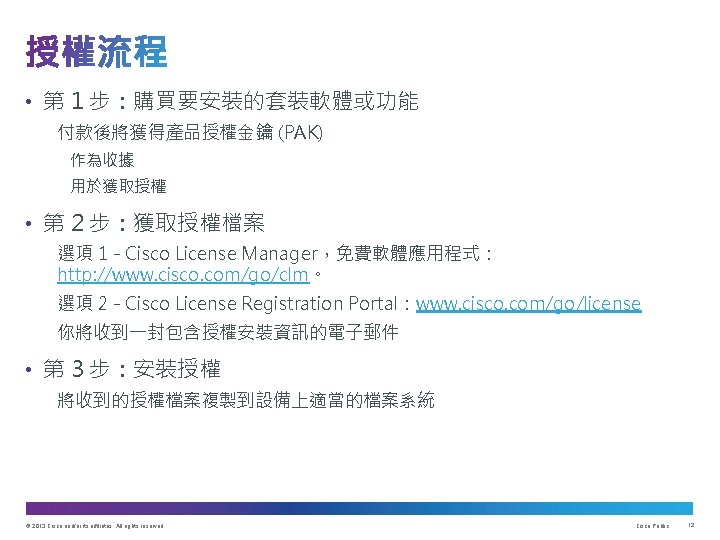 IOS 15 Overview of IOS 15 Licensing and Slides: 14 Download presentation IOS 15 授權和流程概述 Overview of IOS 15 Licensing and Process A. Peter Anderson Associate Professor August 4, 2013 © 2013 Cisco and/or its affiliates. All rights reserved. Cisco Public 2 • 永久授權(Permanent Licenses) • 評估授權(Evaluation Licenses) • 功能授權(Feature Licenses): 軟體啟動功能授權(Software Activation Feature Licenses) 功能使用權授權(Right to Use Feature Licenses) • 訂閱授權(Subscription Licenses) • 計數授權(Counted Licenses) • ISR G 1包含的产品为 1800、2800、3800三个系列。 • ISR G 1 C包含的产品为 1800 C、2800 C、3800 C三个系列。 • ISR G 2包含的产品为 1900、2900、3900三个系列。 © 2013 Cisco and/or its affiliates. All rights reserved. Cisco Public 3 • 技術套件授權(永久/評估) IP Base(僅永久) 安全 資料 統一通信 © 2013 Cisco and/or its affiliates. All rights reserved. Cisco Public 8 • 資料技術套件授權已啟動: 附加軟體啟動功能授權 SNA(系統網路架構)交換 © 2013 Cisco and/or its affiliates. All rights reserved. Cisco Public 10 Thank you.