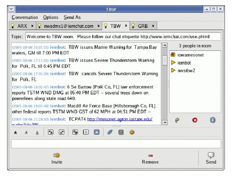 IEM Chat Project Features ● End to end encryption (logins, chats) ● ∞ users in a chat room ● Users can join multiple rooms (multiple WFOs) ● ● ● Rooms have recent history when you join them. Can get caught up quickly. Standards based XML protocol (Jabber). Open Source client (Gaim). Same technology has Google Talk.