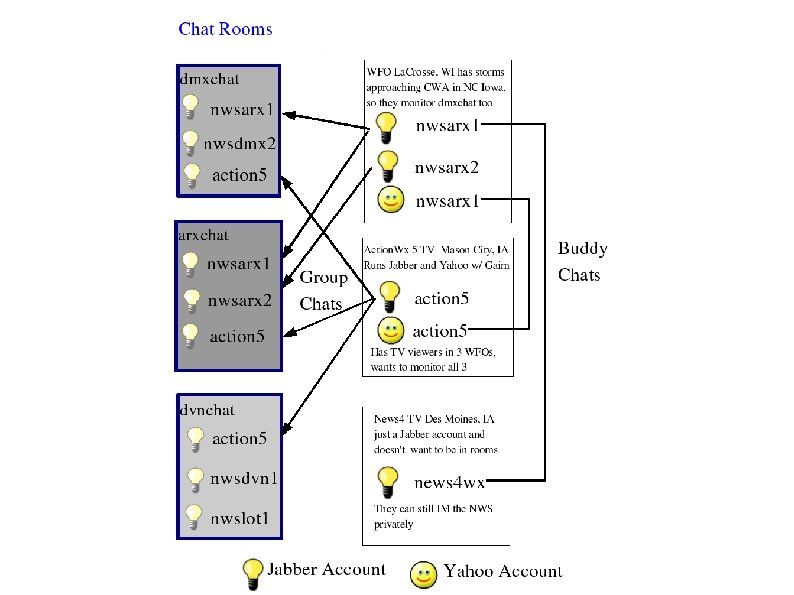 Instant Messaging Background ● ● ● NWS IM with media partners has been around for a while (2000? ) and well regarded Implementation / Policy widely varies with WFO In 2004, we started a Yahoo! Chat between media, IEM, and DMX and had decent success, but. . .