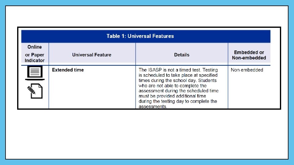 Scheduling Testing • Districts administer the ISASP during the state-designated testing window (March 4 through May 31). • The ISASP is not a timed test. Students who are not able to complete the assessment during the locally scheduled time must be provided additional time during the same testing day to complete the assessment. • Test security issues, and the need to acquire valid assessment results, drive this necessity. Therefore, every effort must be made to see that students finish an assessment on the day that it began. Only extreme circumstances warrant deviation.