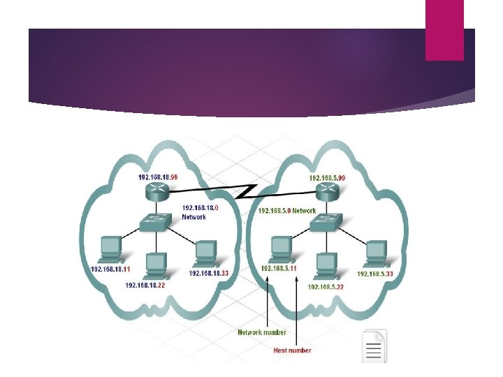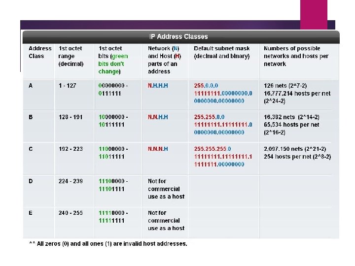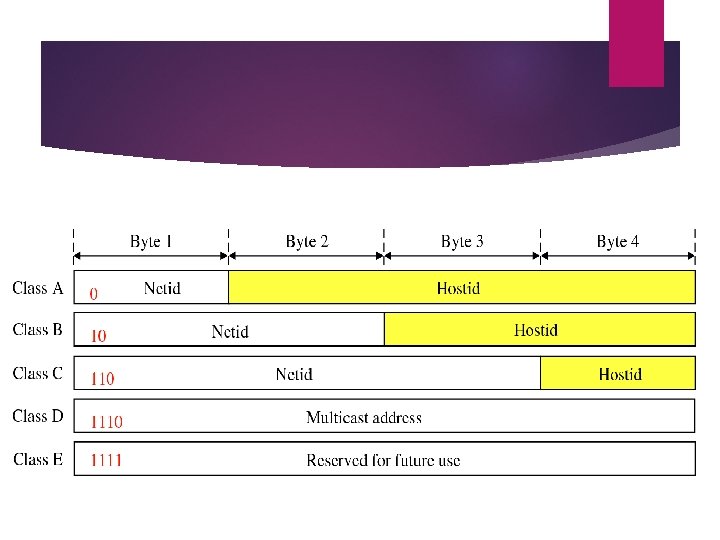 Classes Each class is divided into a fixed number of blocks (that indicate the number of the networks) with each block having a fixed size (the number of the host). An IP address in class A, B, or C is divided into netid and hostid. These parts are of varying lengths, depending on the class of the address