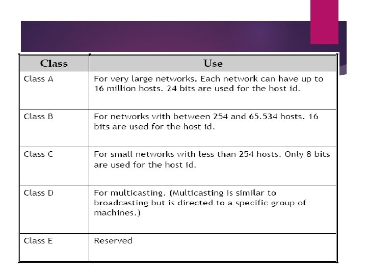 Classes Addresses in classes A, B, and C are for the unicast communication, from one source to one destination. Addresses in class D are for multicast communication, from one source to a group of destinations. Multicast address can be used only as destination address, but never as a source address.