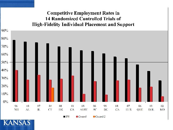 Conclusions: Randomized Controlled Trials of Supported Employment • In 17 of 17 studies, SE had significantly better competitive employment outcomes than controls • Mean across studies of consumers working competitively at some time: » 60% for supported employment » 22% for controls