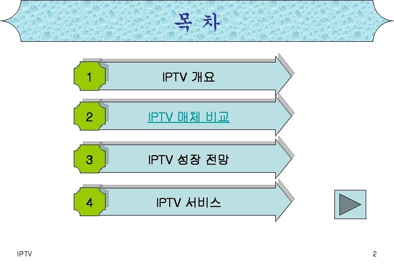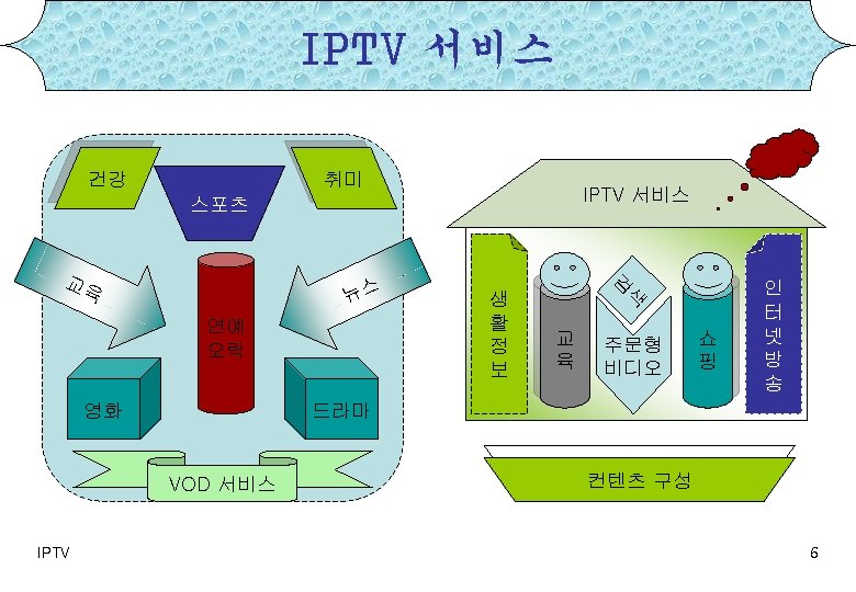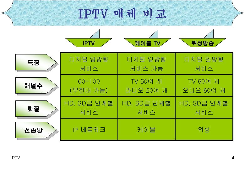 IPTV 개요 v Description of IPTV의 개요 üThe media, by giving consumers a choice of high quality and affordable services are available ü Without time constraints, and you can watch the program every time, TV watching is a variety of services availabble v IPTV의 개요 ü콘텐츠 중심의 서비스로 게임, 주식거래, 교육서비스 등 다양한 서비스 를 TV 를 보면서 동시에 이용 üIP 기반의 통신망을 통하여 전달되는 다양한 콘텐츠를 기존의 TV로 제 공 받을 수 있는 서비스 IPTV 3