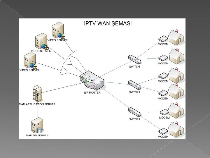 IPTV NEDİR? IPTV iletimi için yüksek bant genişliği gerekmektedir. Ses ve internet erişiminde kullanılan bant genişliği yeterli olmaz. MPEG-2 formatında 3. 75 Mbps. � Standart TV görüntüsü çoklu gönderim (multicast) yoluyla iletilirken talebe bağlı servisler bireye özel olduğundan bant genişliği fazladır. (300 MPEG-2 standart kanal 1 Gbps<50. 000 abone unicast 19 Gbps) � IPTVnin rakipleri olarak havai iletim, Kablo TV ve uydu gösterilebilir. �