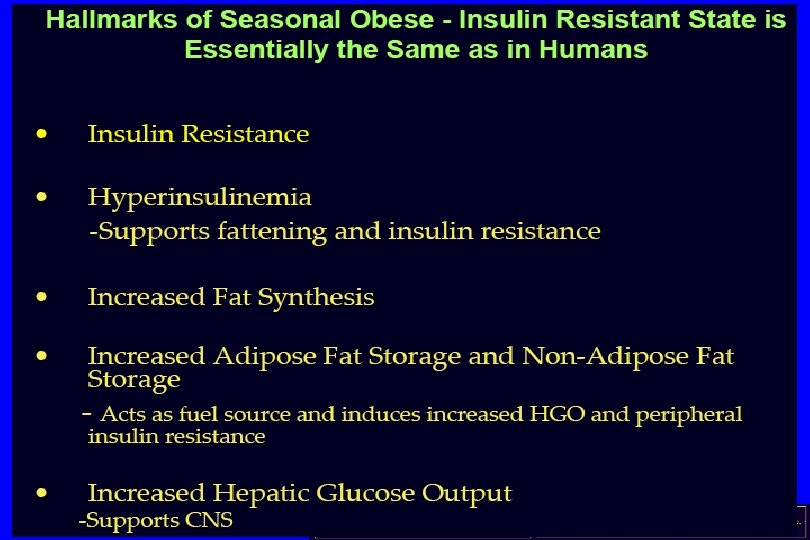 Central Insulin Resistance (IR) a. Increased liver production sugar b. Decreased peripheral Glucose Uptake c. Increased production FFA from Liver and Adipose tissue (alternate fuel source) 1. Normal Response to Hibernation, Migration, Periods of Food lack!! BUT ALSO, Normal DIURNAL VARIATION IN INSULIN SENSITIVITY 2. Centrally Induced IR Exacerbated by: obesity, high fat diets, high CHO diets, abnormal sleep cycle, decreased exercise: translates to IR all day long