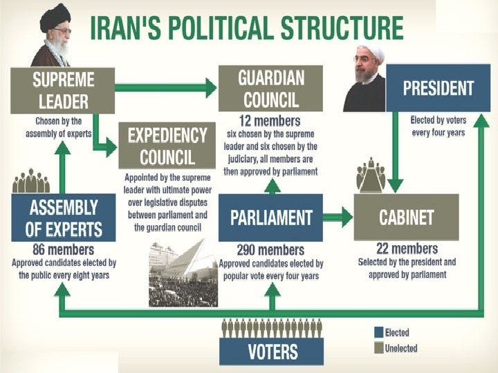 Constitution of Iran Islamic revolution in 1979 – imamate: • Constitution: the supreme power is Allah – Iran is Islamic republic - Source of political power is Allah - Religious leaders: accepted by the poeple, absolute rights over the state system - Equality and participation of the people - Supreme Religious Leader: spiritual power, because represents the 12 th (last) imam - From Mohammed’s bloodline