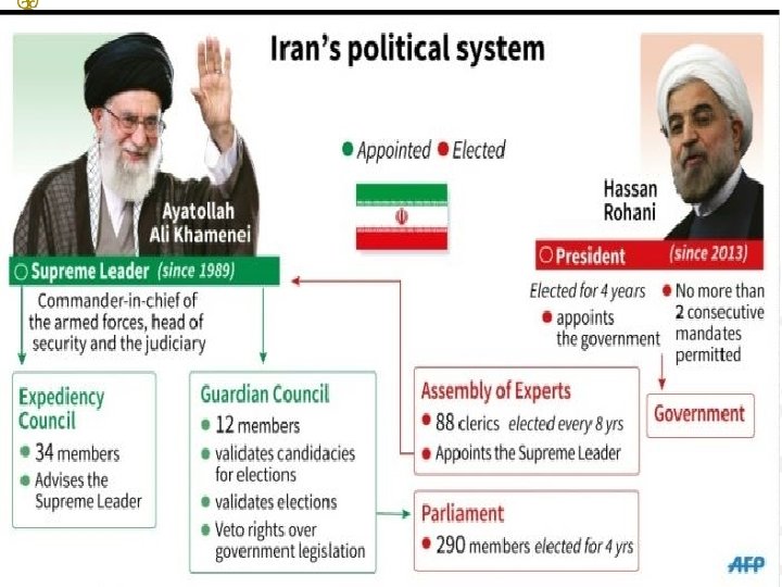 2 supreme legal bodies - The supreme religious leader (ayatollah: Hamanei): political decision making, control over legislative body, executive body and jurisdiction, army and also the Iranian Revolutionary Guard, nomination of MP-s and state officials, his 2000 representatives in the public administration having authorisation to make any intervention to any issues - President of republic: elected, but the candidate should be approved by the religious leadership (Rohani)
