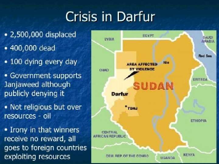 2 civil war between Noth and South • Genocide in Darfur • …. for OIL