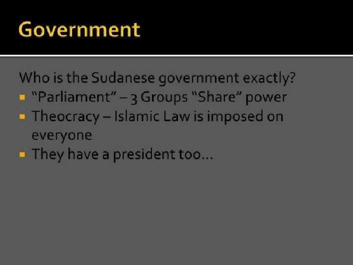 History of Sudan - After getting independence (1956) from UK: weak state, military putsches and civil wars - 1989: Islamist dictatorship – harsh civil wars between South (blacks Catholics) and North (Arabs – Berber - Muslims) - South Sudan: independent state from 2011 (referendum) - North Sudan: Omar al-Basir’s military dictatorship – creation of fundamentalist Islamist Party (Muslim Brotherhood) – parliament, government, jurisdiction: only the member of the Islamist Party can be nominated – Sharia law - 1993: Place of safe haven for bin Laden (place of birth of al. Qaeda – tradition of radical Islam)