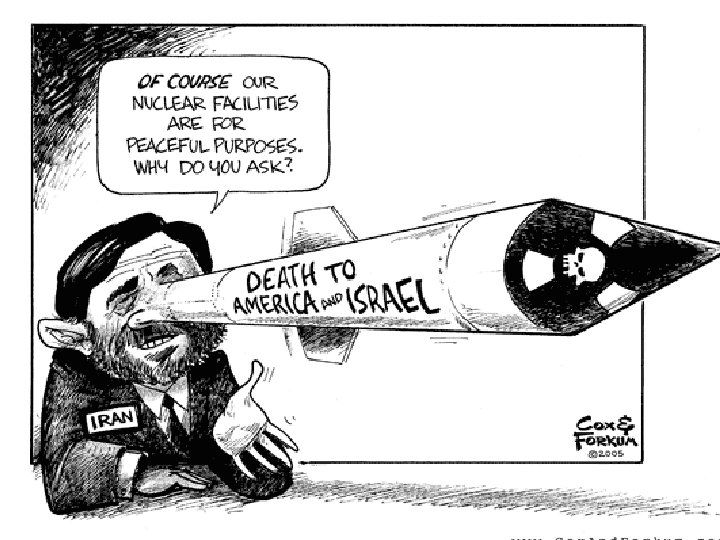 Iran’s Nuclear Program • Started in the 1950 s with the help of the US as part of the Atoms for Peace program • Several research sites, two uranium mines, a research reactor, and uranium processing facilities that include three known uranium enrichment plants. • After delays, Iran's first nuclear power plant, Bushehr I reactor was officially opened in a ceremony on September 12, 2011. There are no current plans to complete the Bushehr II reactor, although the construction of 19 nuclear power plants is envisioned. Iran has announced that it is working on a new 360 MWe nuclear power plant. Iran has also indicated that it will seek more medium-sized nuclear power plants and uranium mines for the future. • Under Ahmadinejad Iran said they were making nuclear energy/power……Are they really making weapons to use on their enemies? ? ?
