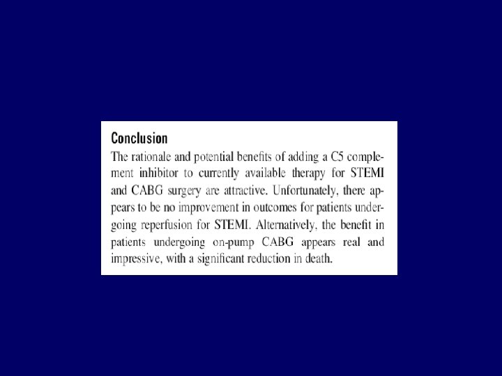 Peak TROPONIN I ng/ml OFF-PUMP CABG ON-PUMP CABG MITRAL SURGERY 1. 2 (0. 9 -1. 9) versus 2. 7 (2. 1 -4. 0) 2. 5 (1. 1 -5. 3) versus 5. 5 (2. 3 -9. 5) 11. 0 (7. 5 -17. 4) versus 11. 5 (6. 9 -18. 8) *P<0. 001 P=0. 7