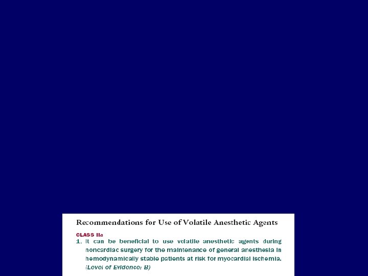 Cardioprotection & anaesthesia Volatile Anesthetics C b blockers “recommended” C Statins “suggested” in selected pts C a 2 agonists “may be considered” in selected pts C Ca++ antagonists “may be considered” in selected pts C Insulin “reasonable” in hyperglycaemic pts C Volatile Anesthetics “can be beneficial”