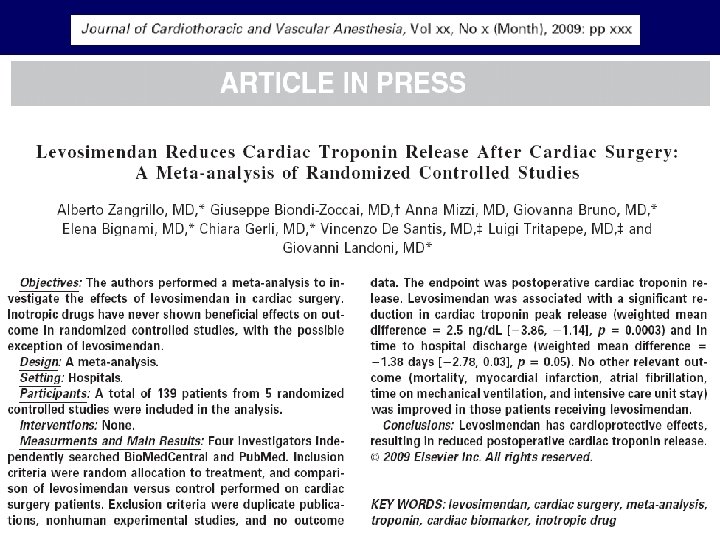 META-ANALYSIS (cardiac anaesthesia) 4 22 randomized studies (15 CPB-CABG; 6 OP-CABG; 1 mitral valve surgery) 4 1922 patients (904 TIVA and 1018 DES or SEVO) 4 16 studies administered volatile anesthetics throughout all the procedure (6 studies for 5 -30 minutes)