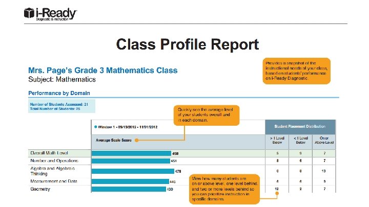 Overview of the Diagnostic ● i-Ready Diagnostic adapts to each student, providing easier or harder questions depending on students’ answers to previous questions. ● Measures Growth ● Based on the Diagnostic results, i-Ready automatically provides individualized online and teacher-led instruction targeted to each student’s unique needs.