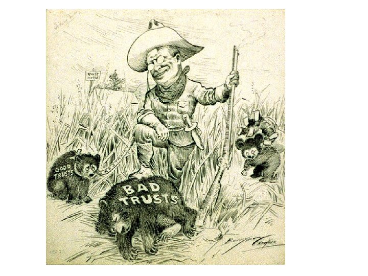 The “Trust Buster” • 1900 - 4/5 of industries = trusts • Uses Sherman Anti-Trust Act to sue 44 trusts • TURNING POINT: gov’t regulating biz