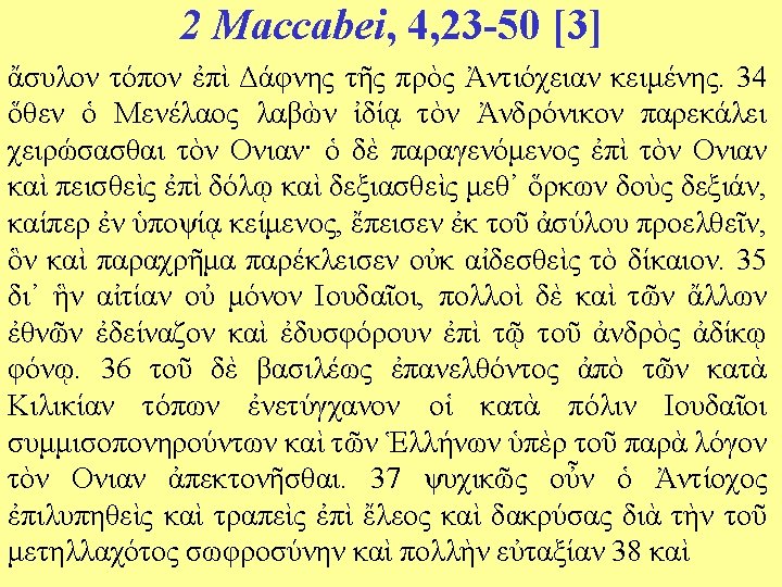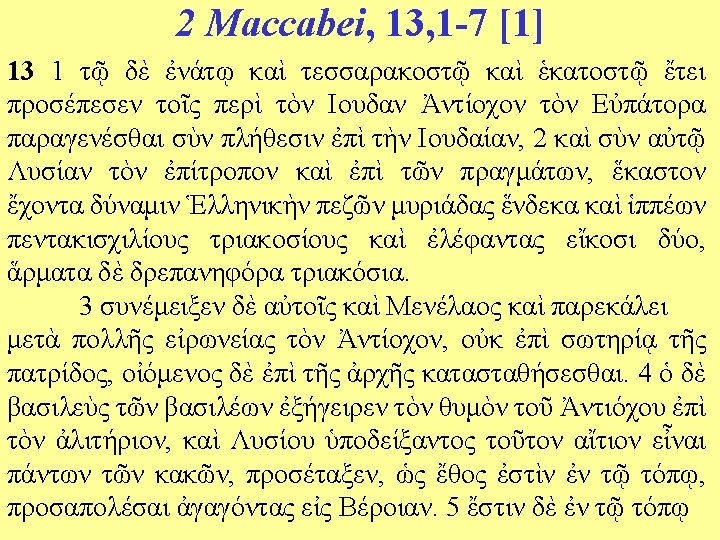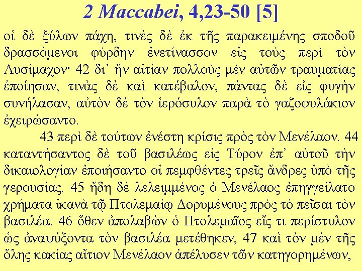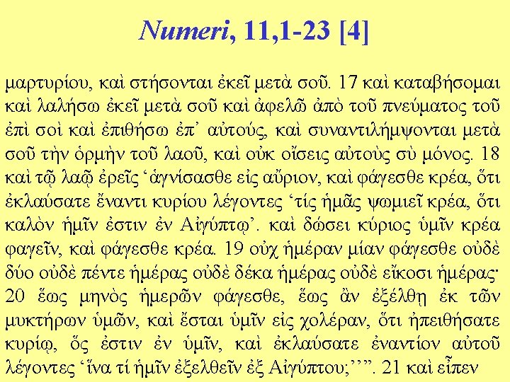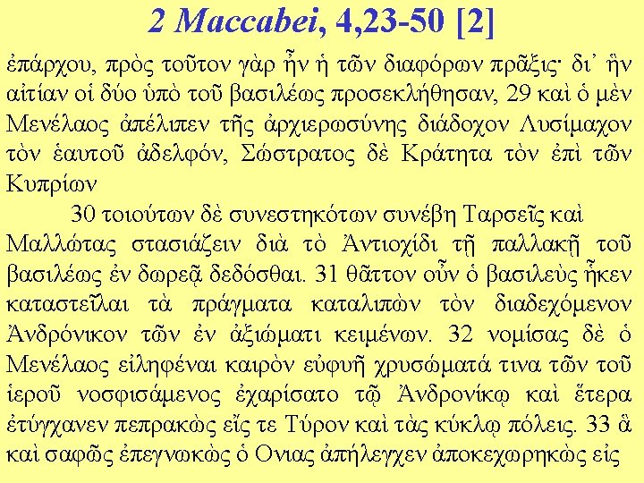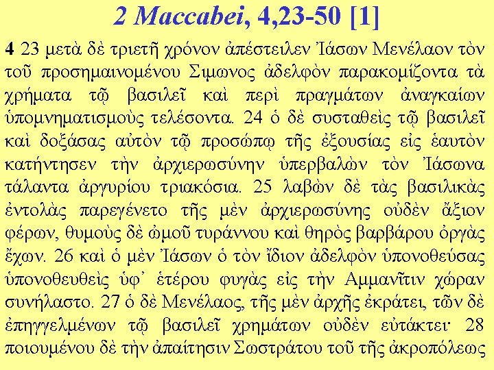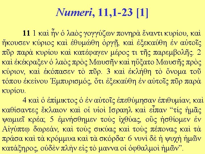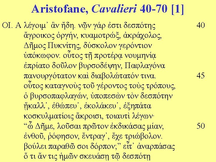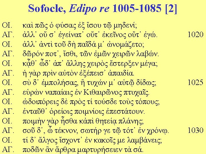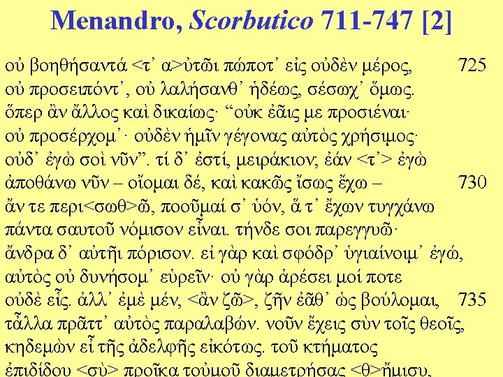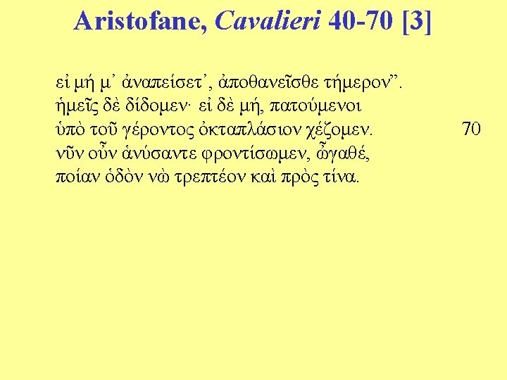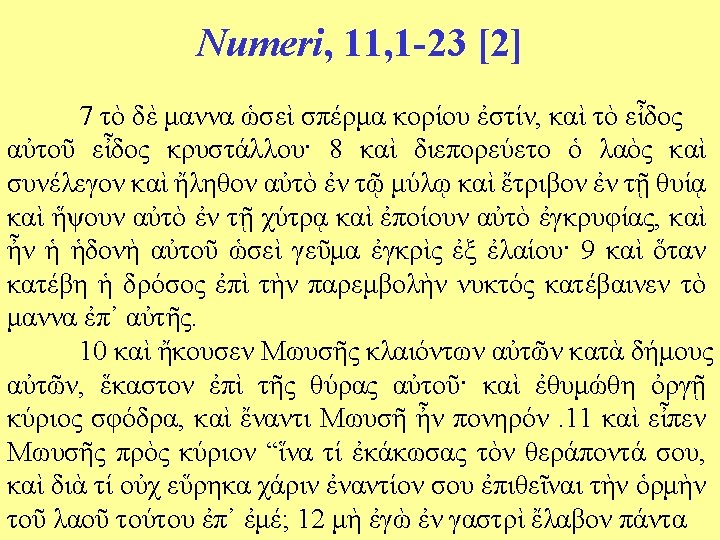 Le fonti della koiné I testi documentari (lettere, conti, ecc. ) e gli errori (ει/ι, la pronuncia delle occlusive, α/ε, gli errori dei forestieri). Papiri (Egitto ed Ercolano ante 79 d. C. ) e iscrizioni: le differenti tipologie di errore. I testi letterari e gli inconvenienti della ‘tradizione’ (quella ‘a monte’: letterarizzante; quella ‘a valle’: analogista e/o innovatrice); i testi documentari come indicatori della lingua d’uso nelle opere letterarie. I testi ‘paraletterari’: i Settanta e il Nuovo Testamento; il valore documentario dei testi biblici per lo studio della koiné e l’antichità della loro tradizione (il Vaticano e il Sinaitico del IV sec. , l’Alessandrino del V sec. ); il problema della paternità delle particolarità (gli autori o i copisti? ). L’influenza del parlato sulla lingua ufficiale: l’esempio di οὐδείς/οὐθείς e dei gruppi ‑ττ‑/‑σσ‑. I testi letterari non arcaizzanti (Aristotele, Menandro, Polibio) e il greco moderno: l’evoluzione della lingua.