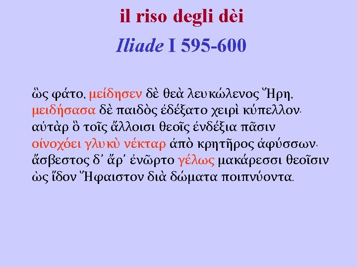 riso e sorriso • il divino sorriso di Era • la pacificazione • il banchetto come luogo del riso • conciliazione e autoironia • il riso e la relazione Maggiore/minore • saper ridere e saper fare ridere • il riso che ‘sorge’