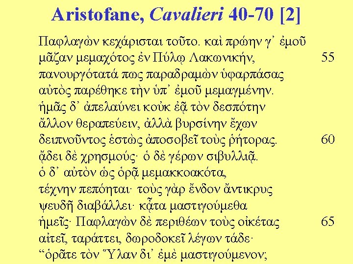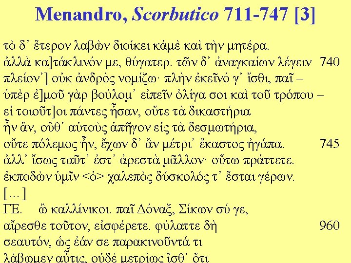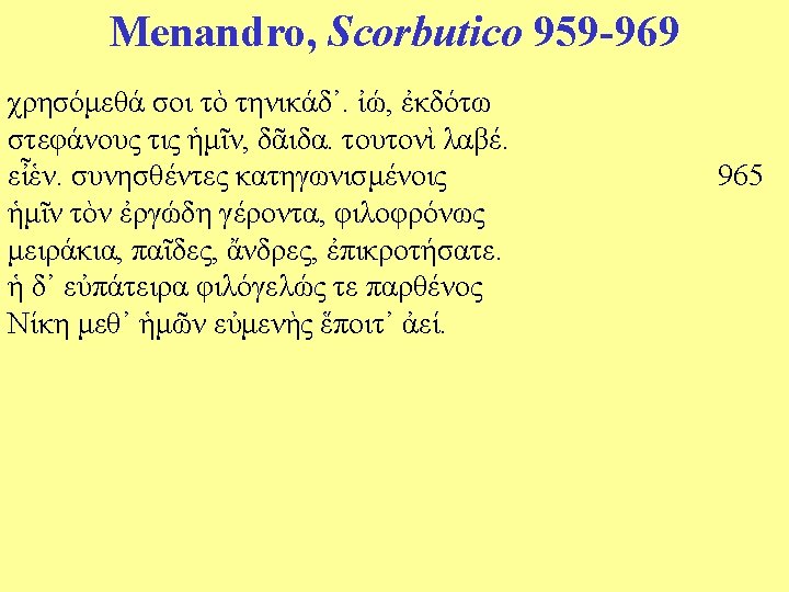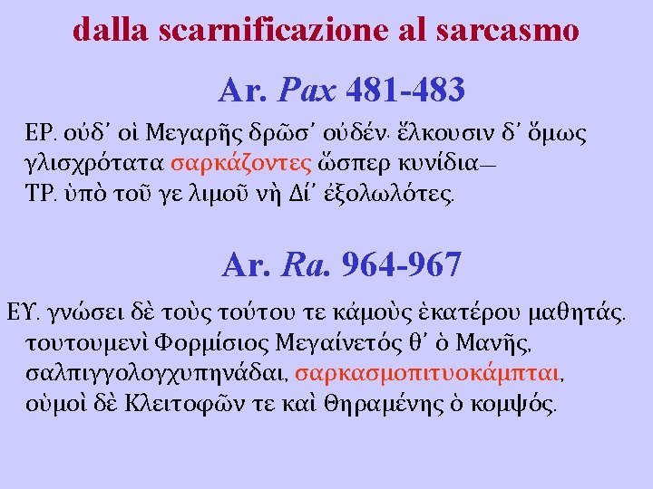 La commedia attica L’ateniese parlato e le differenze tra Aristofane e Menandro: i volgarismi. La grammatica attica (imperativi in ‑ο e in ‑σο, ἔδοσαν ed ἔδωκαν, futuri dorici e non, ἔμελλον ed ἤμελλον, comparativi in ‑ω e in ‑ονα, πλέον / πλεῖον ἢ …), i cori e i composti paratragici (e paraepici e paralirici), gli ‘stranieri’ parlanti nei dialetti locali (le lingue diverse ma comunicanti), i metricismi (-οιατο, -μεσθα, etc. ), Erfindungen comiche. La letteratura ateniese e panellenica.