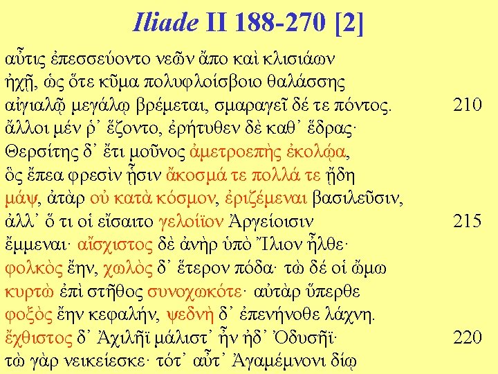 Tersite: il primo personaggio comico • la petulanza • la deforme bruttezza • la ghignante contestazione del potere • l’amore per la disputa e per la discordia • la propensione all’insulto • il disfattismo demagogico • la turpe cattiveria irrisa Il riso degli integrati come conferma dei valori in gioco